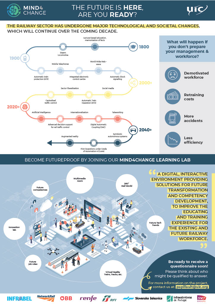Mind4Change is the new way to think in the future. It’s a collective commitment to prepare the railway sector for The Digital Revolution. Its purpose is to help the railway industry stay safe, competitive, and future-ready through a coordinated transformation of skills, mindsets, and operational practices.